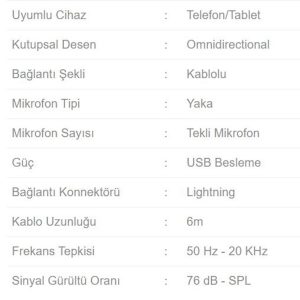 Boya BY-M2 Lisanslı iphone Uyumlu Yaka Mikrofonu 2 Yıl Resmi Distribütör Garantili; Boya BY-M2 yaka mikrofonu apple cihazlar için üretilmiş sertifikalı net, yüksek kaliteli ses kaydı almanızı sağlayan profesyonel bir yaka mikrofonudur.; Mikrofon ile lightning dönüştürücü birbirinden ayrılabilir. ; Dilerseniz dönüştürücü kabloyu cihazınıza farklı bir mikrofon veya ses kaynağı bağlamada da kullanabilirsiniz. ; Lightning konnektörü ile herhangi bir iOS cihaz ekipmanına doğrudan bağlanır ve gücünü telefondan alır ekstra güç gerektirmez.; Çok yönlü klipsli mikrofon; Çoklu kullanım için ayrılabilir tasarım; Apple MFi sertifikalı Yıldırım konektörü; 3,5 mm olan diğer mikrofonlara izin verir; İOS cihazlarına TRS çıkışı; Pil gerektirmez; Dönüştürücü prensibi: Condenser Mikrofon; iOS İşletim sistemi desteği: Minimum iOS 8.0; Mikrofon Polaritesi: Çok yönlü (Omnidirectional); Sinyal/gürültü oranı: 76dB veya daha fazla; Frekans Aralığı: 50 Hz-20 kHz; Hassasiyet: -40dB+/-3dB (0dB=1V/Pa, at 1KHz); Bit Rate: 16Bit, 24Bit; Örnekleme frekansı: 44.1 / 48 kHz; Güç Gereksinimi: Telefonunuzdan güç alır; Kablo Uzunluğu: 6m; Ağırlık: 46g; Uyumlu Cihazlar:; Phone X, iPhone 8/8 Plus, iPhone 7/7 Plus, iPhone SE, iPhone 6s / 6s Plus, iPhone 6/6 Plus, iPhone 5c, iPhone 5’ler, iPhone 5; iPad mini 4, iPad mini 3, iPad mini 2, iPad mini, iPad Pro, iPad (2017), iPad Air 2, iPad Air; iPod Nano (7. nesil), iPod touch 6, iPod touch 5; Paket İçeriği: Boya BY-M2 Yaka mikrofonu, 3.5mm to lightning kablo, mikrofon klipsi, sünger, taşıma çantası, ingilizce kullanım kılavuzu.; OMNİ-DİRECTİONAL MİKROFON NEDİR?: Omnidirectional (heryönlü/küresel); Her taraftan gelen sesi eşit hassasiyette alır.; STOK KODU : ETNA00468
